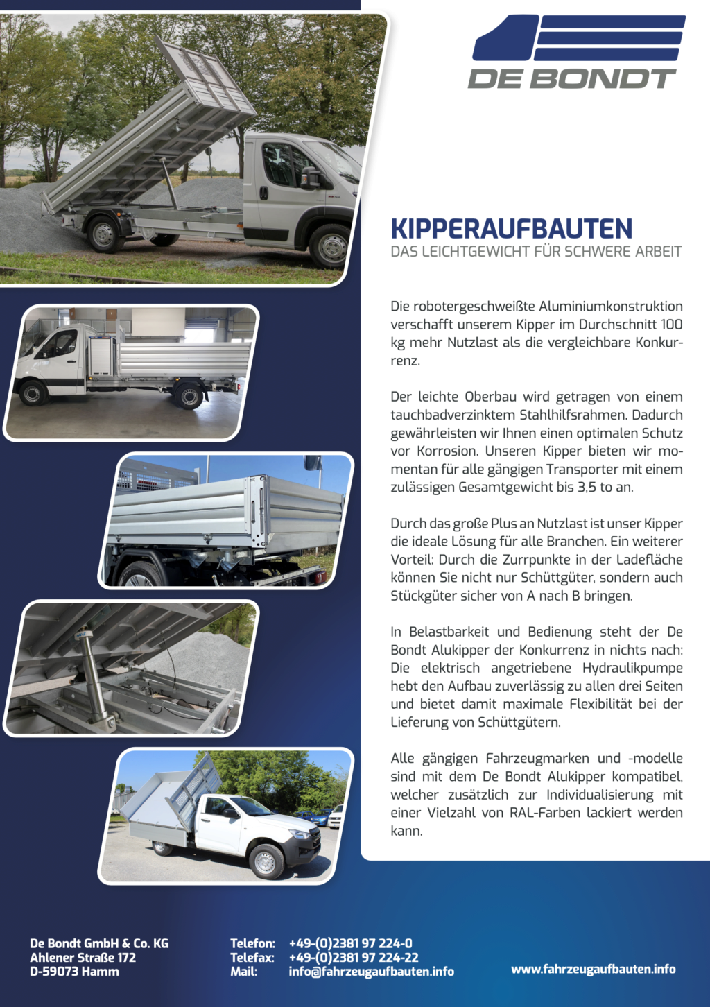Wie in unserer Historie erkennbar, ist das Unternehmen De Bondt Fahrzeugaufbauten seit über 25 Jahren auf dem Markt der Nutzfahrzeugaufbauten tätig. Im Jahr 2020 sind wir mit unserem ersten eigenen Produkt auf dem Markt. Unser neuer Alukipper ist durch seine leichte Bauweise die perfekte Ergänzung unseres Produktportfolios.